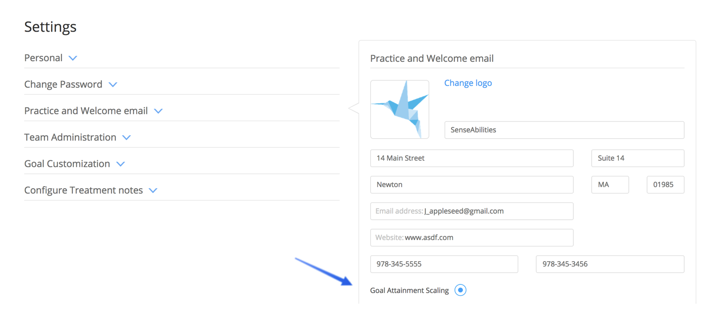 To enable goal attainment scaling, browse to the Settings page from the top right navigation dropdown. In the Practice and Welcome email section, select the radio button next to the goal attainment scaling label to enable this feature.