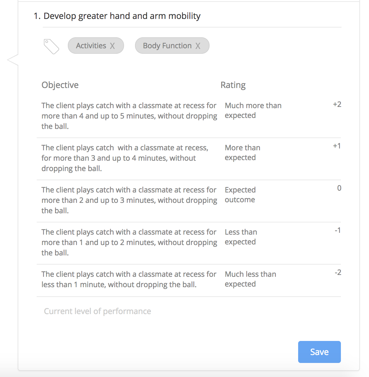 As you develop a list of scaled goals for your client, you may tag each goal with specific goal areas. For goal attainment scaling, goal areas include: Body Function, Activities, Participation, Accommodation, and Family.